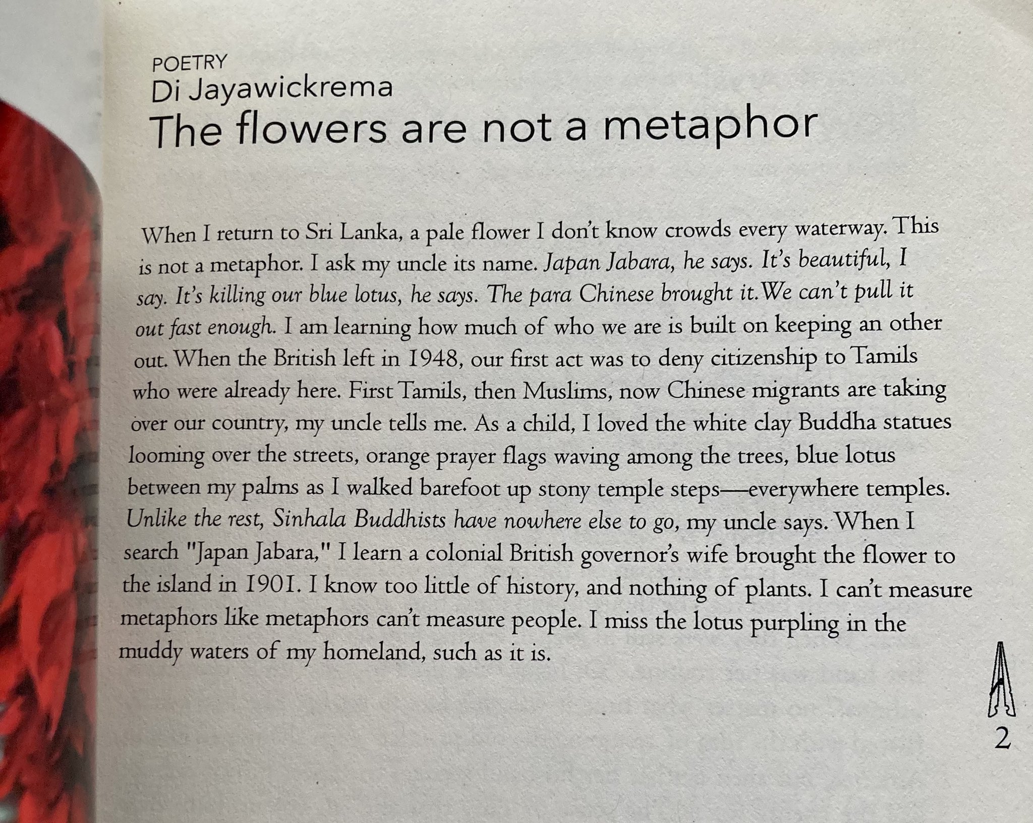 This is a prose poem that frustrated me for years: it would never do what I wanted it to do. I was scared to publish it even if I could finish it: would my family come across it and hate me for speaking about my ethnicity and country this way; do I even have a right to write about Sri Lanka when I’ve lived in the U.S. for so long; would people think this is really my uncle in the poem (it’s not); would they read the speaker as me (it’s not quite); is it cowardly to end on an ambivalent note when there’s nothing ambivalent about the reality of Sinhala Buddhist supremacy in Sri Lanka? These questions are probably familiar to many diaspora writers grappling with the weight of their histories. Some of my answers to these questions are still evolving and will probably continue to since I’m nowhere near done with the subject but I’m glad I published the piece. And I’m glad to find on recent reread that it does more of what I hoped than I remembered. To me, this is a piece that isn’t and maybe can’t really be “finished,” but like a lot of things in my life, I’m finding peace with that. The whole issue is full of ambitious, beautiful work and I’m proud to be in its company. You can buy the issue here.